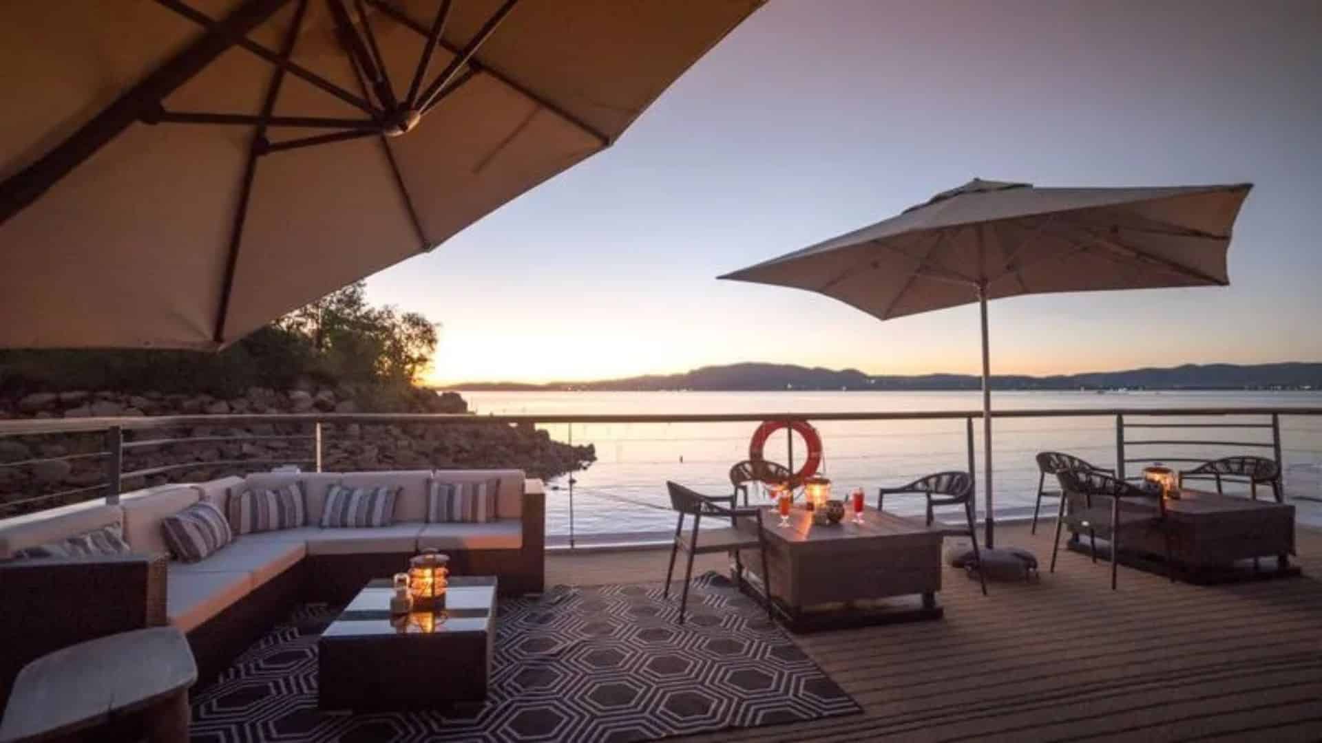 Déjeuner africain dans un restaurant flottant avec vue sur le paysage.