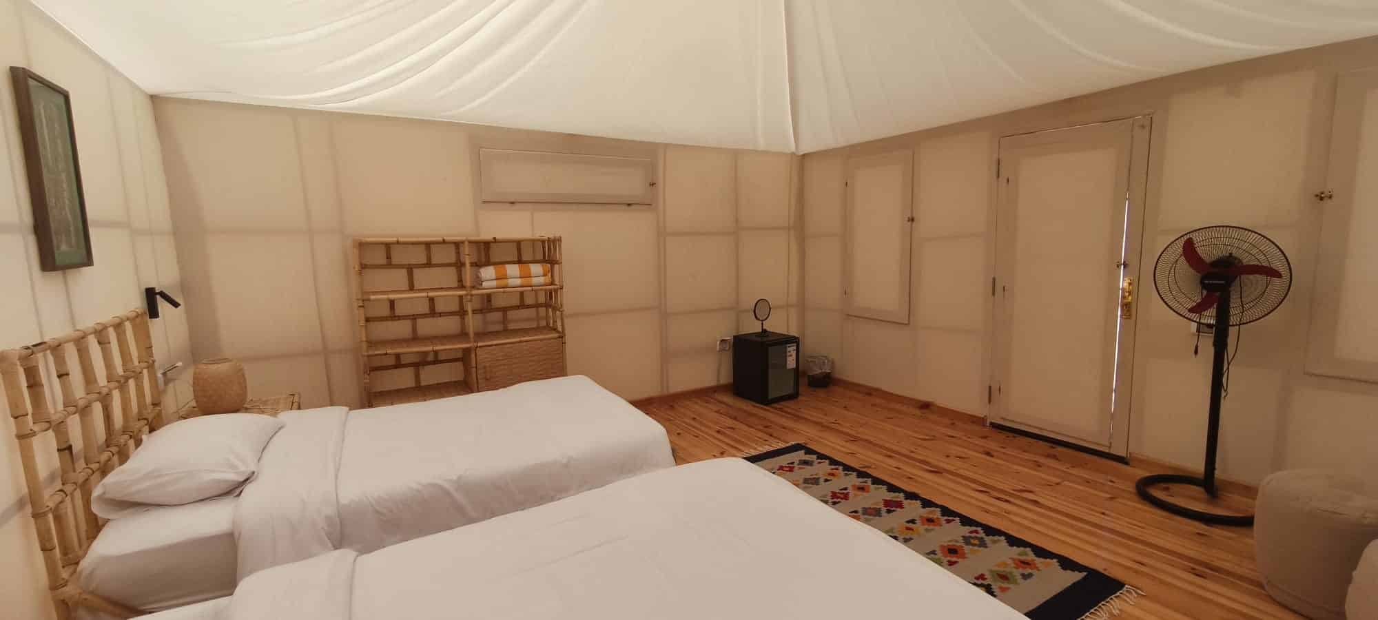 Situées proche de l’eau comprenant 1 ou 2 lits, ventilateur, mini-frigo et « petit salon ». Les blocs sanitaires sont disséminés dans le campement. Des blocs toilettes et douches sont à disposition.